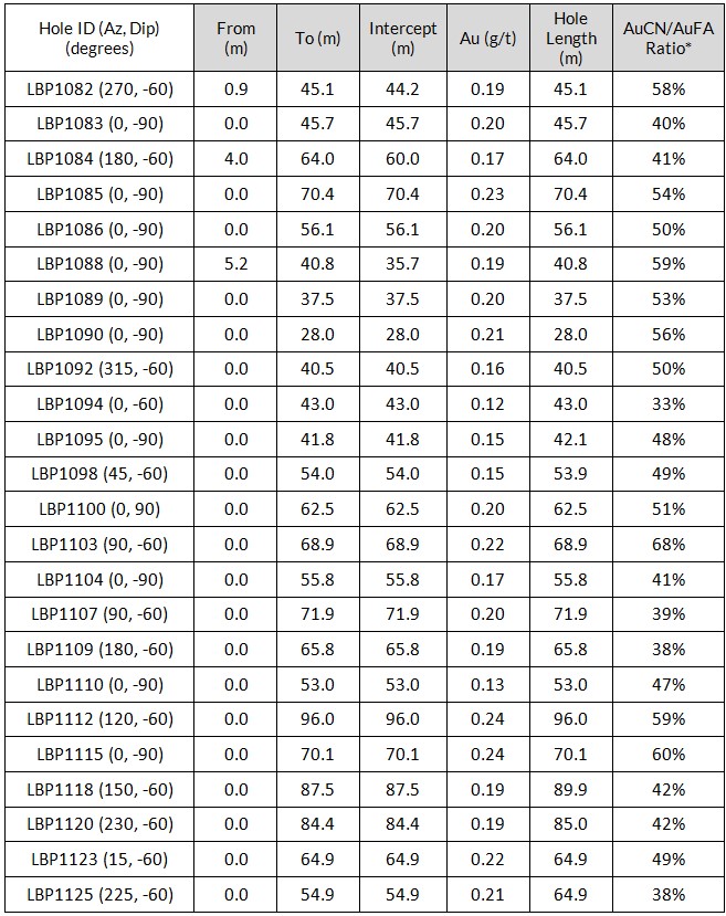 Table 1: Heap Leach Fire Assay intervals and Cyanide Solubility data