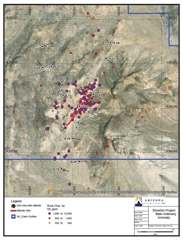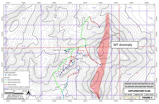 The Company submitted a Notice of Intent (NOI) to the US Bureau of land Management to drill 27 reverse circulation drill holes from 17 drill pads and build associated access road (Figure 3). Approval of the NOI was received on September 18, 2025 subject to posting of the appropriate financial guarantee for site reclamation (bond). The bond was posted on September 23, 2025, and formal approval to proceed with roadwork and drilling is pending. Twenty-four (24) of the proposed holes will test the quartz-antimony veins and three holes will test the nearby MT anomaly that was detected and quantified by a helicopter MT survey over the property in May-June 2023. See website at https://Arizonagoldsilver.com/Silverton/ for more details on the MT survey.