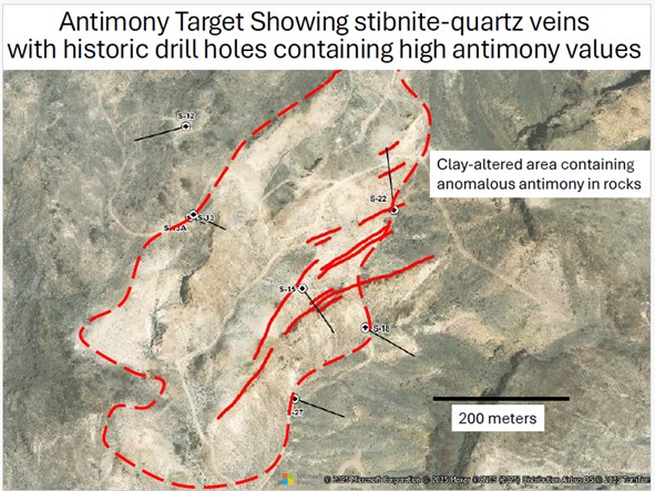 Newcrest Resources drilled 15 RC (reverse circulation) percussion holes that all contained anomalous antimony values, including one hole (S-18) which intersected 20 feet at +1% Sb (they did not assay the over-limits) between 100-120 feet (30-5-36.6 meters) depth. Historic geologic mapping on the property identified numerous discrete quartz-stibnite veins and stringers, but the economics of antimony were not encouraging enough to target these vein swarms specifically with drilling. The Company has re-assessed the quartz-stibnite vein occurrences and has identified a zone roughly +900 meters by 400 meters which shows up on satellite imagery as highly clay-altered and contains the preponderance of quartz-stibnite veins and stockworks (Figure 2).