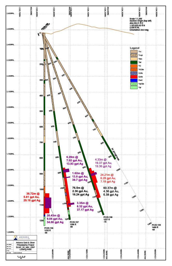 Vancouver, British Columbia, January 06, 2026 – Arizona Gold & Silver Inc. (TSXV: AZS) (OTCQB: AZASF) is pleased to announce it has received assays from the latest core hole, PC25-158 on the Philadelphia project in Arizona. This hole extends the wide zone of high-grade gold mineralization in the Perry Discovery 110 metres (“m”) north from hole PC25-156. Drilling is continuing with PC25-159 stepping out a further 60m to the north.