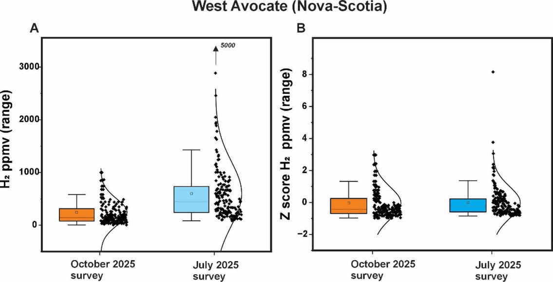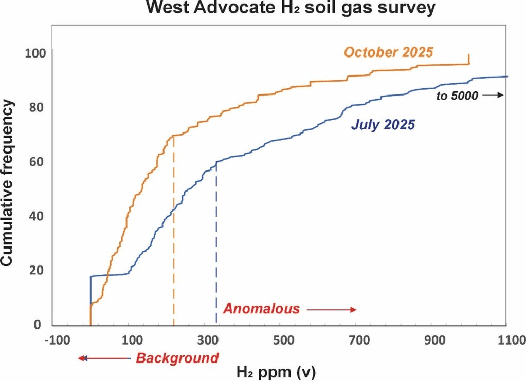 “The second soil-gas survey conducted during the fall and early winter of 2025 confirms that hydrogen anomalies initially identified during the summer program persist despite differing seasonal and atmospheric conditions. After normalizing the datasets to account for temperature and pressure effects, the results clearly delineate three highly anomalous hydrogen sectors at West Advocate. The persistence and spatial coherence of these anomalies strongly support a structurally controlled geological hydrogen system.”