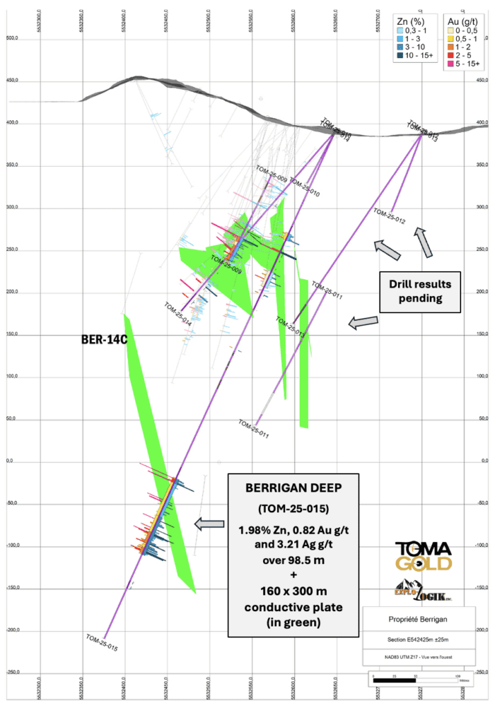 David Grondin, President and CEO of TomaGold, stated: “The geophysics confirm what our drill cores indicated: Berrigan Mine sits on a large-scale mineralized system. The BER-14C plate, in particular, extends the mineralization signature of holes TOM-25-014 and TOM-25-015 with a vector pointing to an even more conductive zone to the northeast.”