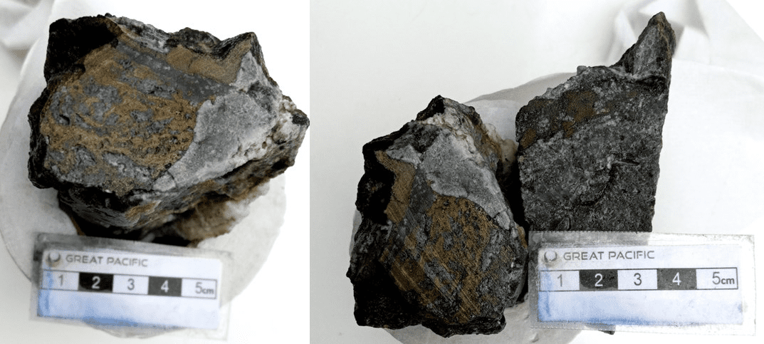 Photo 2: Cut hand specimens from the Magiabe West Vein discovery outcrop, displaying quartz-sulphide veining with visible semi massive chalcopyrite and bornite mineralization. Sulphides occur as disseminations and semi-massive patches within silicified quartz-rich host material. Scale bar shown in centimetres.