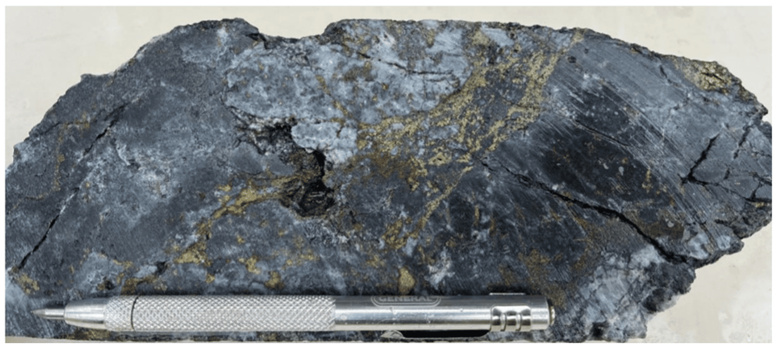 Photo 3: WDG-08 drill core from Northern Sulphide Shoot at Sinivit: 8.4 m @ 50.12 g/t AuEq3 from 154.0 meters (46.46 g/t Au, 1.90% Cu, 59.63 g/t Ag)2, showing a high-grade Au-Ag-Cu polymetallic quartz-sulphide vein intersection. Visible chalcopyrite and bornite occur as fracture fill and semi-massive patches along vein margins and fracture surfaces. Scribe shown for scale.