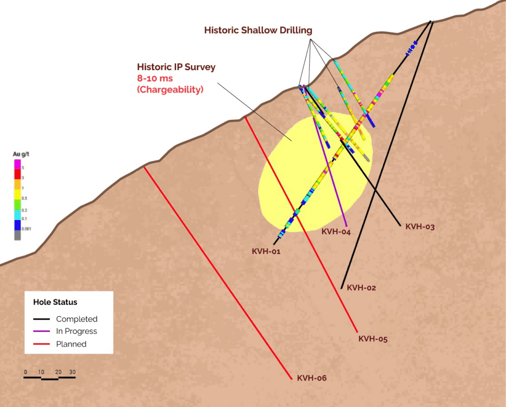 Drilling has now progressed to KVH-04, which is being drilled from the same pad and designed to test beneath the KVH-03 intercept. The close spacing of these holes is intended to better constrain the structural controls on mineralization, evaluate short-range grade and structural continuity within the vein system, and assess potential grade variability commonly observed in epithermal gold systems.