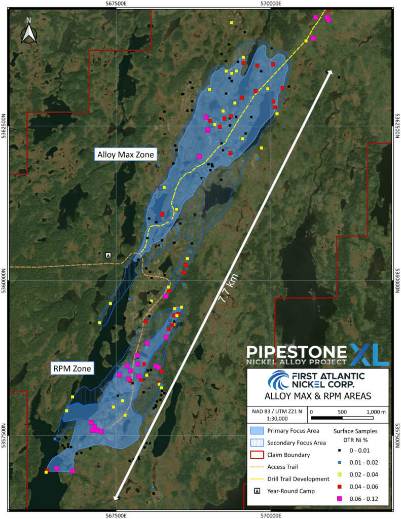 The Alloy Max zone was discovered through the Company’s ongoing district-wide surface sampling program, which integrates field geological mapping, rock sampling, Davis Tube Recovery (“DTR”) metallurgical testing, and geophysics to identify magnetically recoverable nickel in awaruite alloy mineralization throughout the 30 km trend. This work has outlined an initial target area at Alloy Max of approximately 4 km in length and 1.2 km in width (see Figure 1), with DTR surface sample grades similar to those observed at the RPM Zone. Geophysical processing on this target indicates the potential for a larger mineralized area than the RPM Zone. At the RPM Zone, this pattern is well established, where drill cores consistently return higher grades than weathered surface samples. Alloy Max is fully permitted and funded for drilling, with ground access in place, minimal overburden, and numerous drill targets identified.