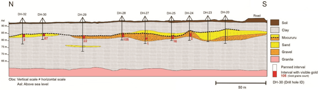 Recent shallow drilling targeting interpreted paleochannel environments has intersected continuous sand and gravel horizons ranging from approximately 1 to 3 metres in thickness at depths of 10 to 20 metres. These results are consistent with the Company’s geological model for preserved auriferous fluvial systems.