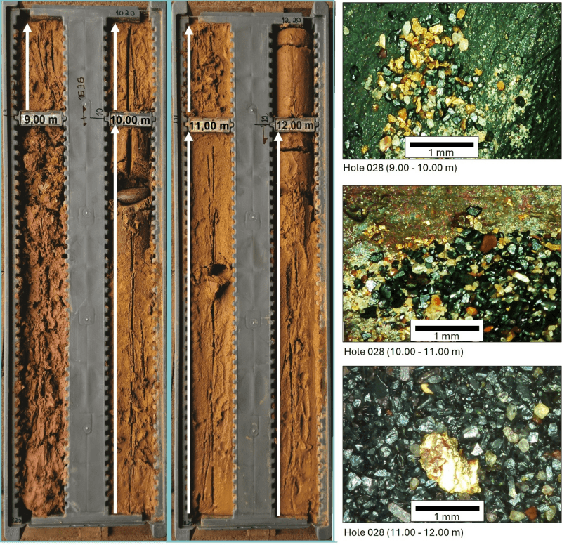 Based on these early-stage results, the Company’s preliminary interpretation indicates a preserved paleochannel system width exceeding 200 metres has been intersected. While still at an early stage of exploration, these results indicate potential for a laterally extensive gold-bearing system, subject to additional drilling, sampling, and analysis.