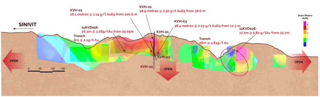 - Confirms broad zone of silica flooding, quartz veining and brecciation from near surface previously shown in hole KVH-01, which returned 58.9 metres @ 2.50 g/t AuEq (see Table 2)