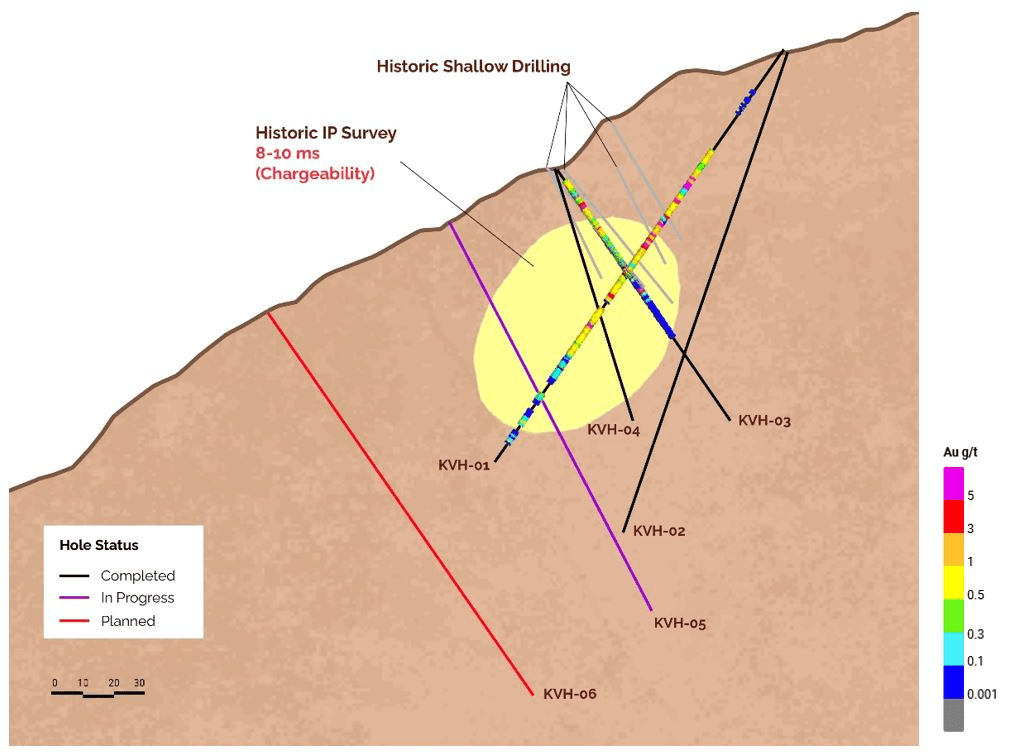Drill hole KVH-04 was designed to test the down-dip extension of the KVH-03 intercept from the same drill pad, with approximately 20 metres of vertical spacing between the holes. This close-spaced drilling approach is intended to better constrain the geometry of the mineralized structure, assess short-range continuity, and evaluate variability typical of epithermal gold systems.