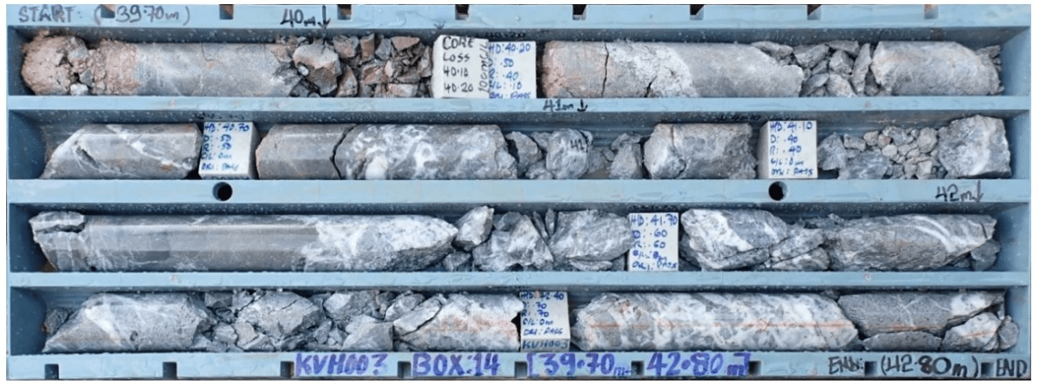 KVH-03 successfully confirmed the updated geological model, intersecting a broad zone of silica flooding, quartz veining and brecciation consistent with the mineralized system observed in KVH-01. The alignment of geological characteristics with those previously reported provides additional confidence in the broader interpretation of the system and supports the view that selected historical drilling may be relevant to the current geological interpretation, subject to ongoing review and validation.