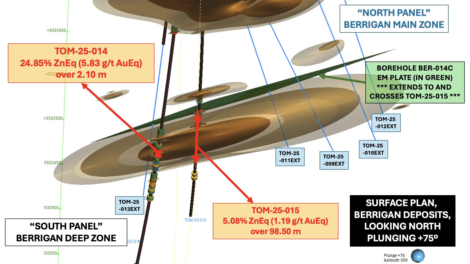 David Grondin, President and CEO of TomaGold, stated: “This next phase will allow us to the test the potential of the Berrigan Deep zone, where our best intercept to date returned 5.08% ZnEq (1.19 g/t AuEq) over 98.50 m, including 23.20% ZnEq (5.44 g/t AuEq) over 4.90 m in drill hole TOM-25-015. Through these five extension holes, we aim to reach the core of the modeled conductive plates, which could significantly increase the volume of identified mineralization.”